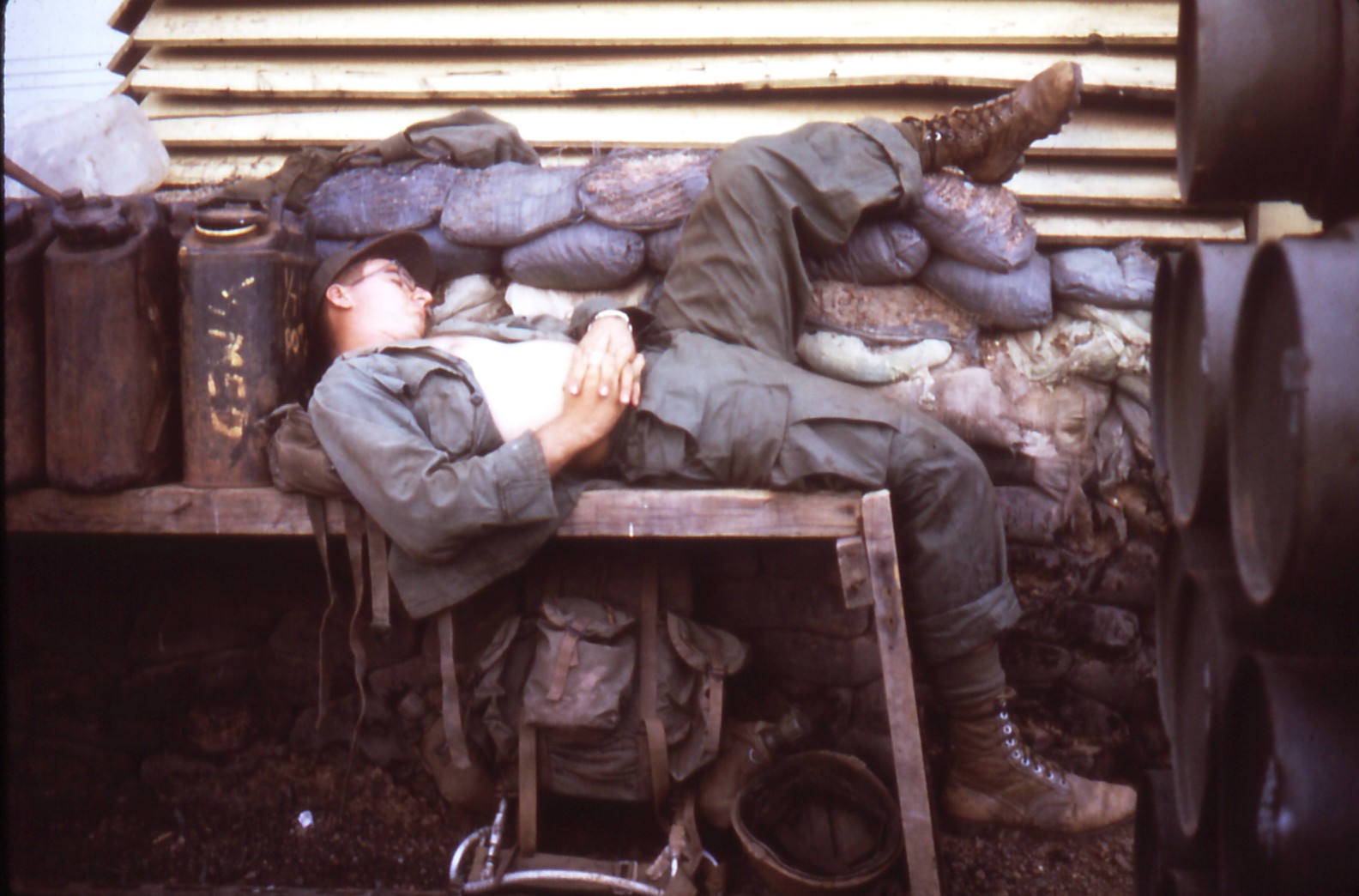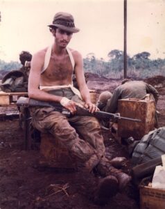 enemy. In one part of the interview Marc recalls having a nightmare while sleeping 4 feet away from his friend Jerry, lying head to toe. He says “that night I slept with all my ammo on, my 45 and my M-16,” then describes “in the nightmare, the NVA have gotten past the perimeter and they’re crawling towards me.” He woke up from the nightmare, saw feet next to him, and says, “I take out my 45, I pull the hammer back and I pointed it at these feet.” Then the moon came out and he saw that the tread on the boot was American, realizing it wasn’t the enemy.
